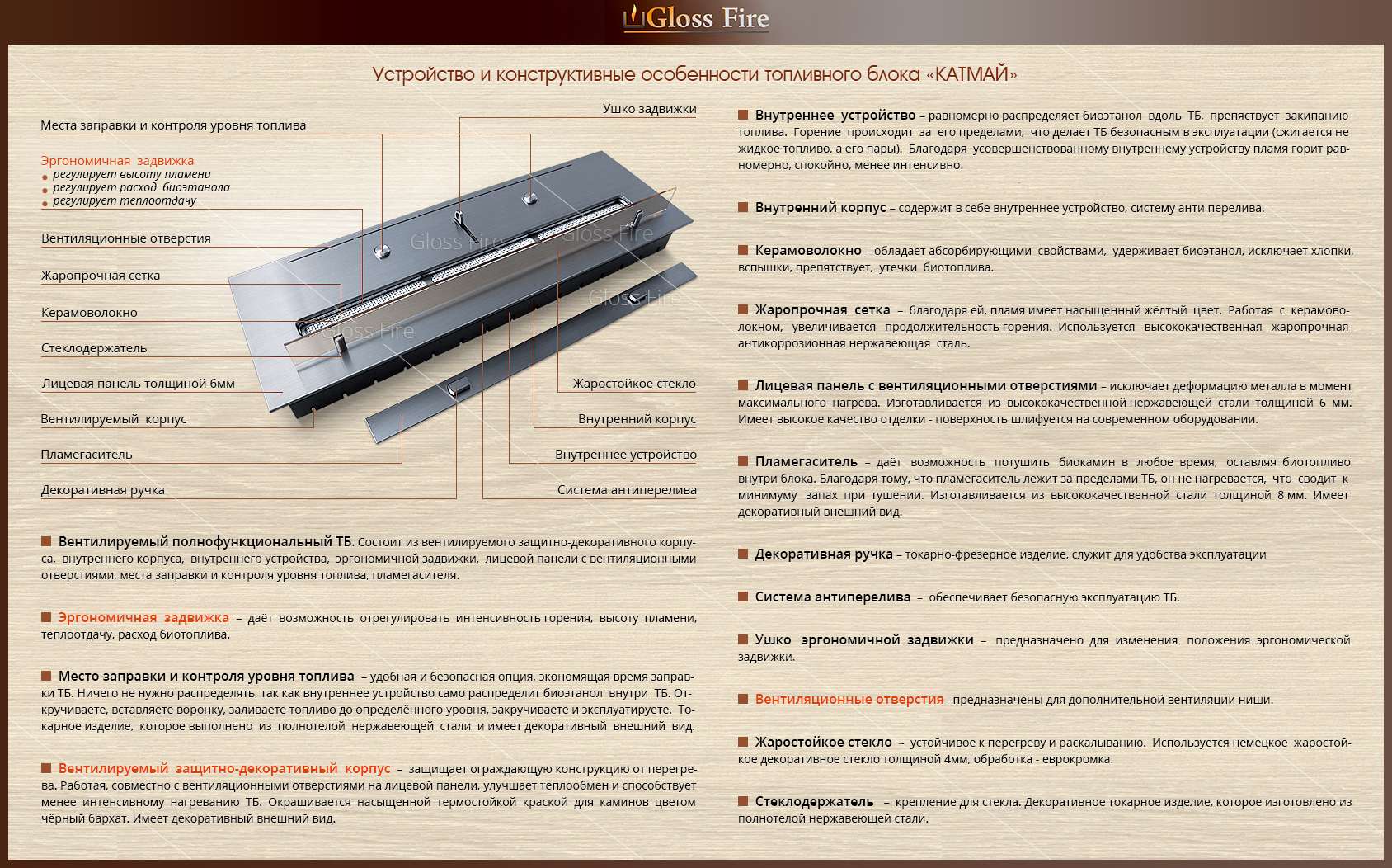 - Внутрішнє заповнення - керамічні волокна з абсорбуючими властивостями, утримують біоетанол, виключають бавовни, спалахи, перешкоджають витоку біопалива. > Працюючи з керамоволокном, полум'я має насичений жовтий колір.