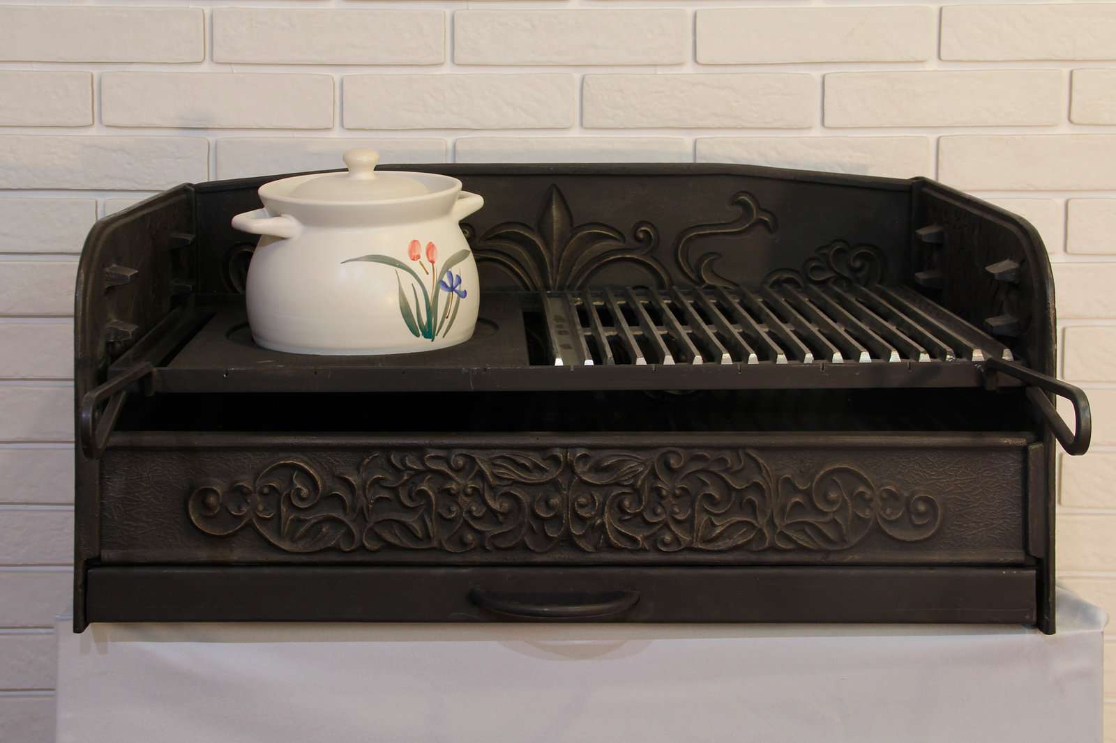 Чавунна вставка в барбекю "Лілія" зі знімним зольником і аксесуарами в комплекті. 495 х 320 мм Можливо використання: з шампурами або грати - гриль на 2-х рівнях приготування їжі. Особливості: - задня стінка з чавуну товщиною 15 мм