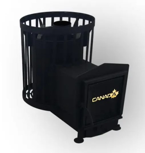 Технічні характеристики Дров'яної печі для лазні та сауни Canada Бочка 15 м.куб. (з виносом) та дверцятами без скла