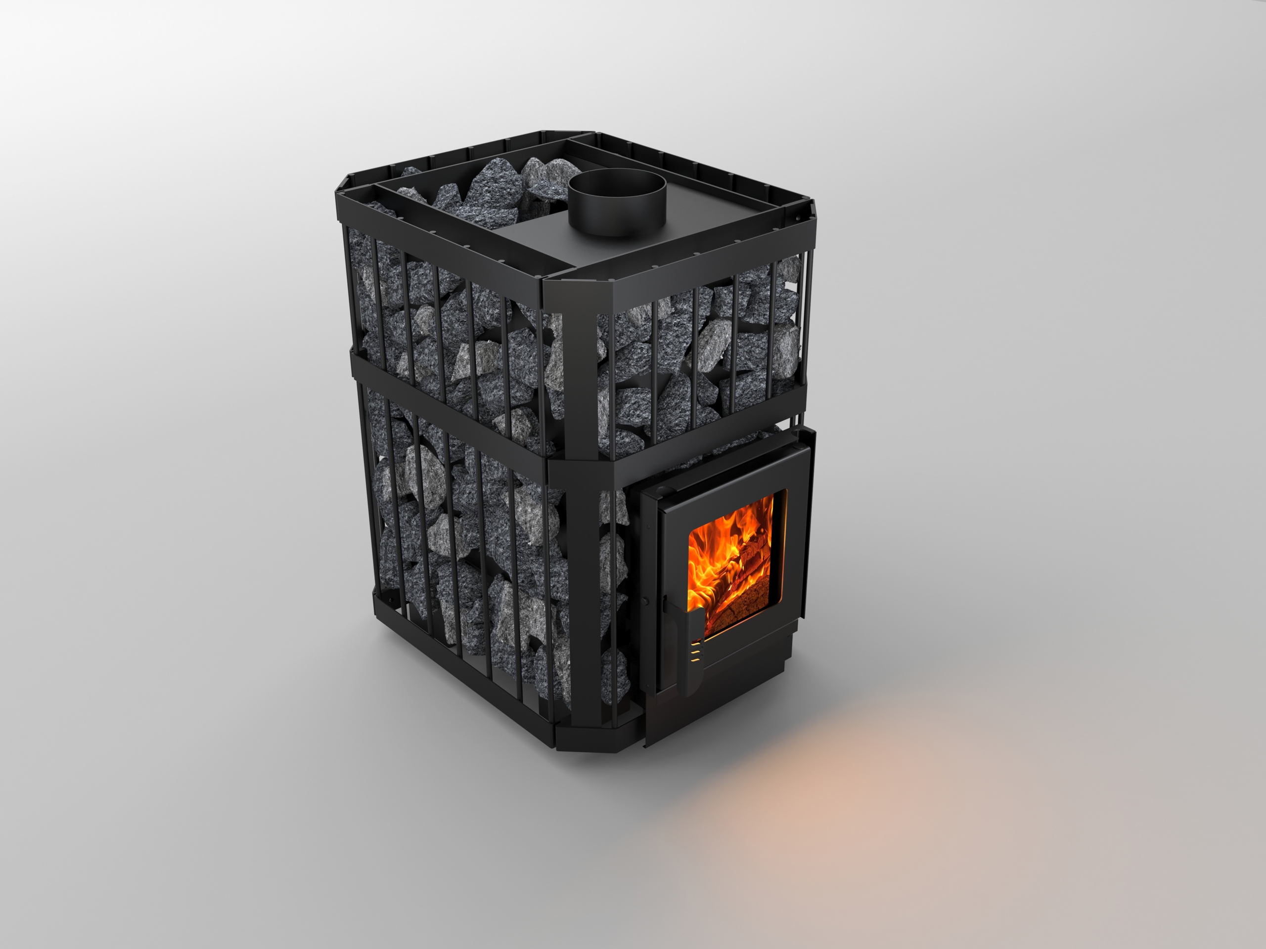 Велика ємність для каміння у вигляді сітки навколо всієї топки печі.