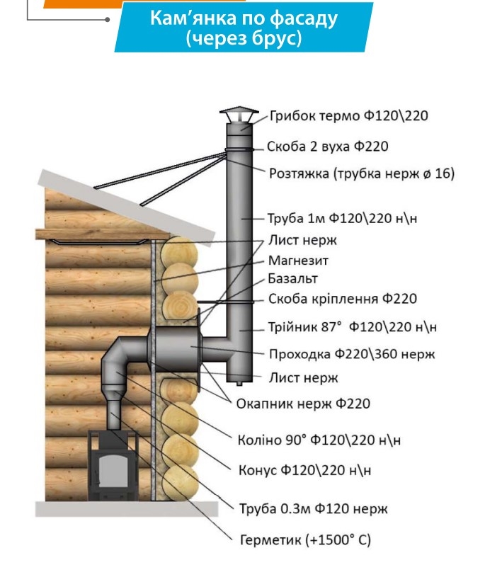 Димохід для лазні - Двостінний Термо (ф120/220 мм) - (1 мм-AISI 321) з Титаном - нерж/оц |