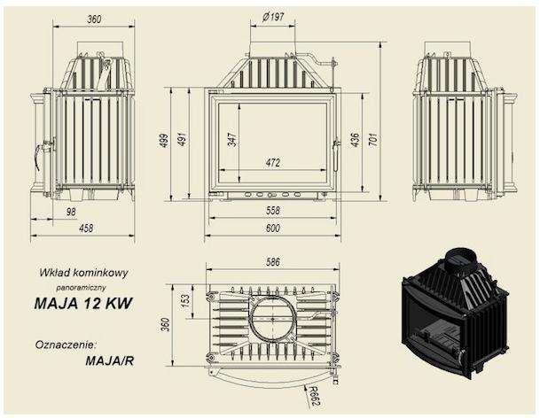 | | | Камінна топка Maja 12 R- невелика чавунна топка з бічним відкриттям дверцят і панорамним склом. Особливості: - ліве бічне відкриття дверей