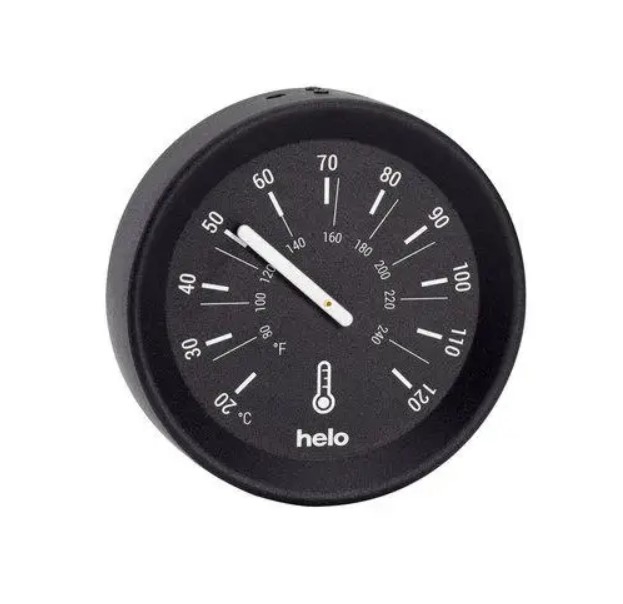 Термо-гігрометр Harvia A-210-THS - чорний, сталева кромка вимірює температуру від 30 до 120 градусів, відносну вологість від 0 до 60%.
