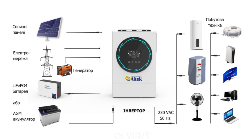 Сонячний інвертор та зарядний пристрій - за допомогою цього інвертора можна конвертувати енергію від сонячних панелей або вітроелектростанцій у змінний струм для живлення будь-яких електричних пристроїв у вашому будинку.