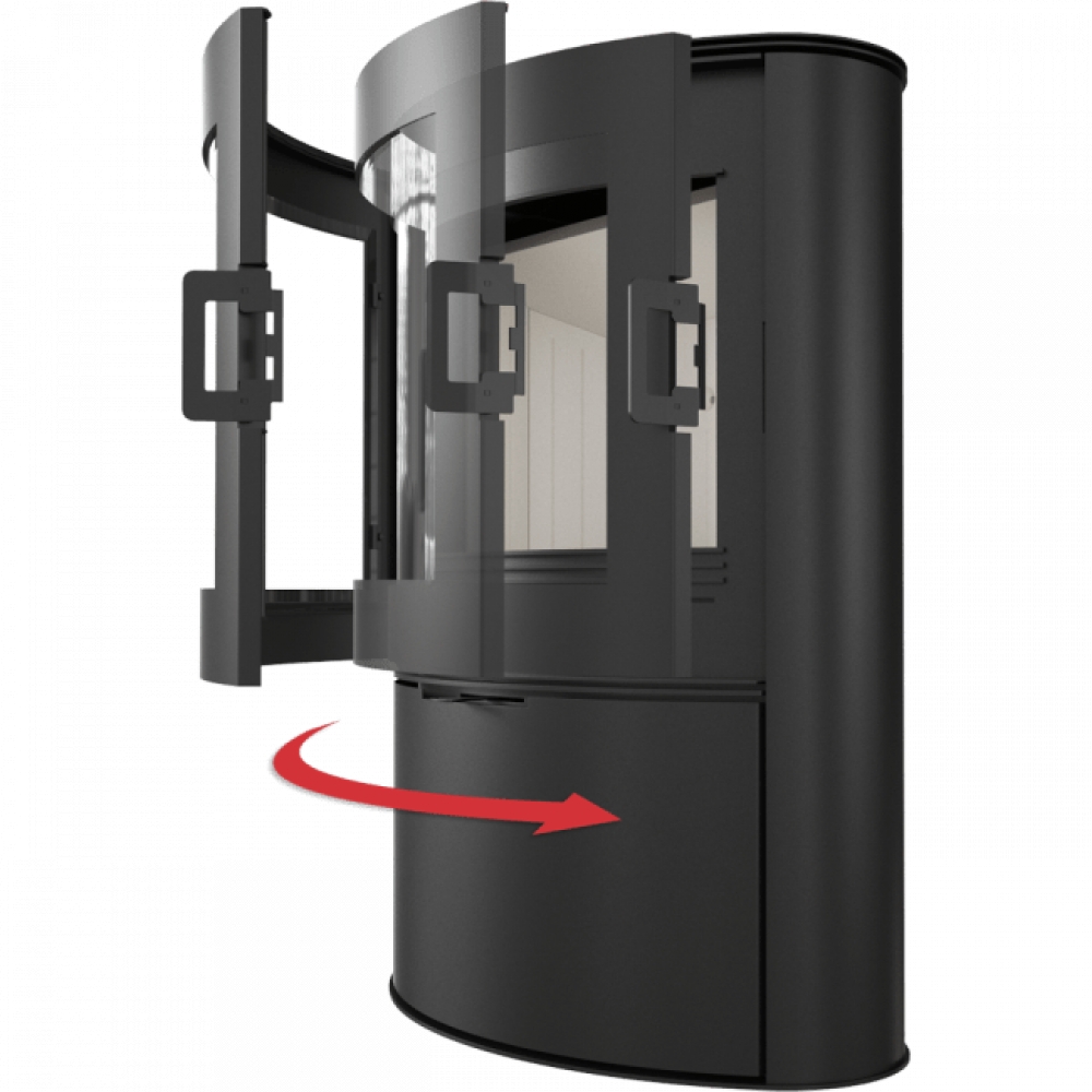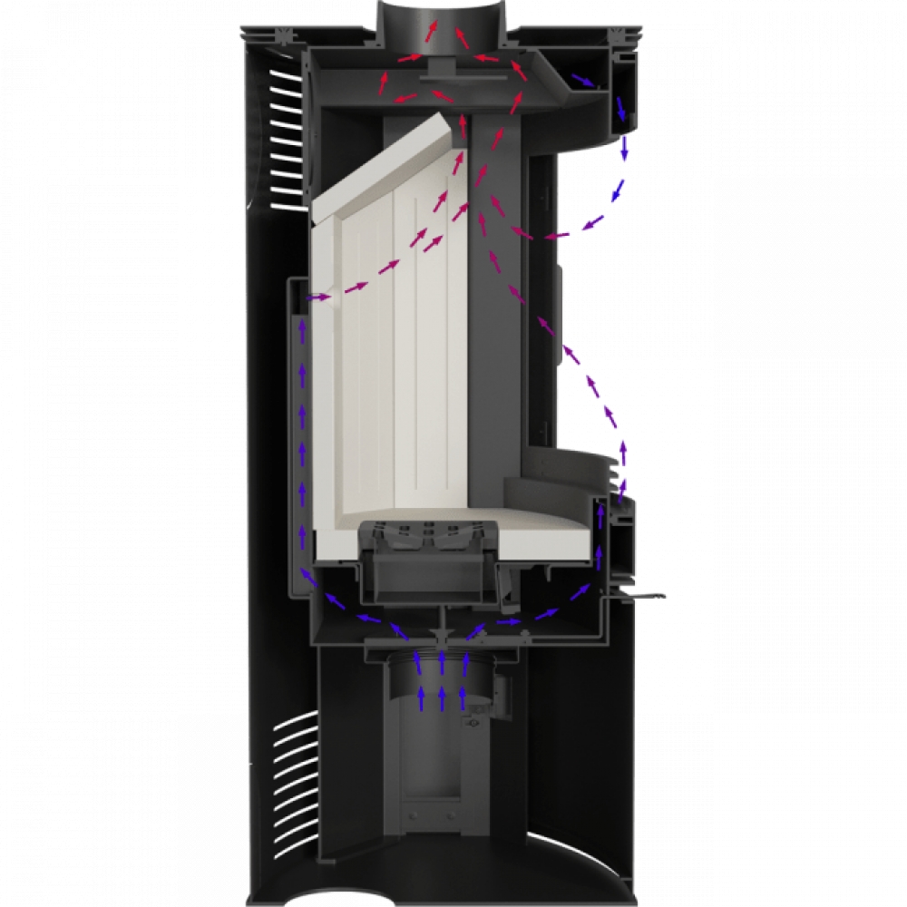- Топка має потрійну подачу повітря в камеру згоряння: первинне повітря потрапляє в камеру горіння. з нижню частину камери; вторинне повітря потрапляє до камери горіння спеціальним каналом на задній стінці через ряд отворів; Піч має систему повітряної завіси. Повітря рухається вздовж скла і не дає можливості осідання сажі та пилу на склі. керамікою Acumotte.