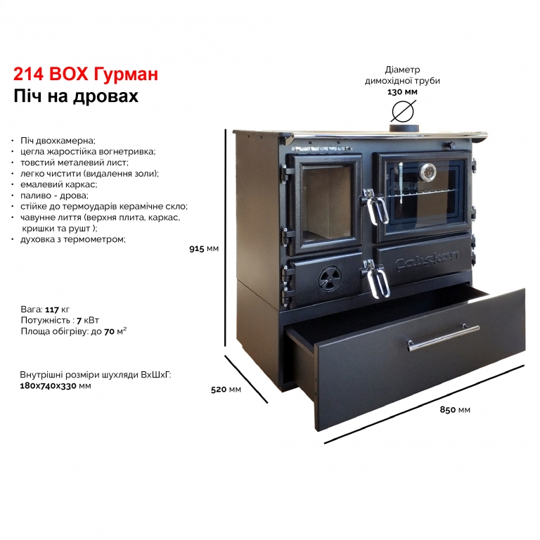 • Емальована унікальна духовка поруч з камерою згоряння.