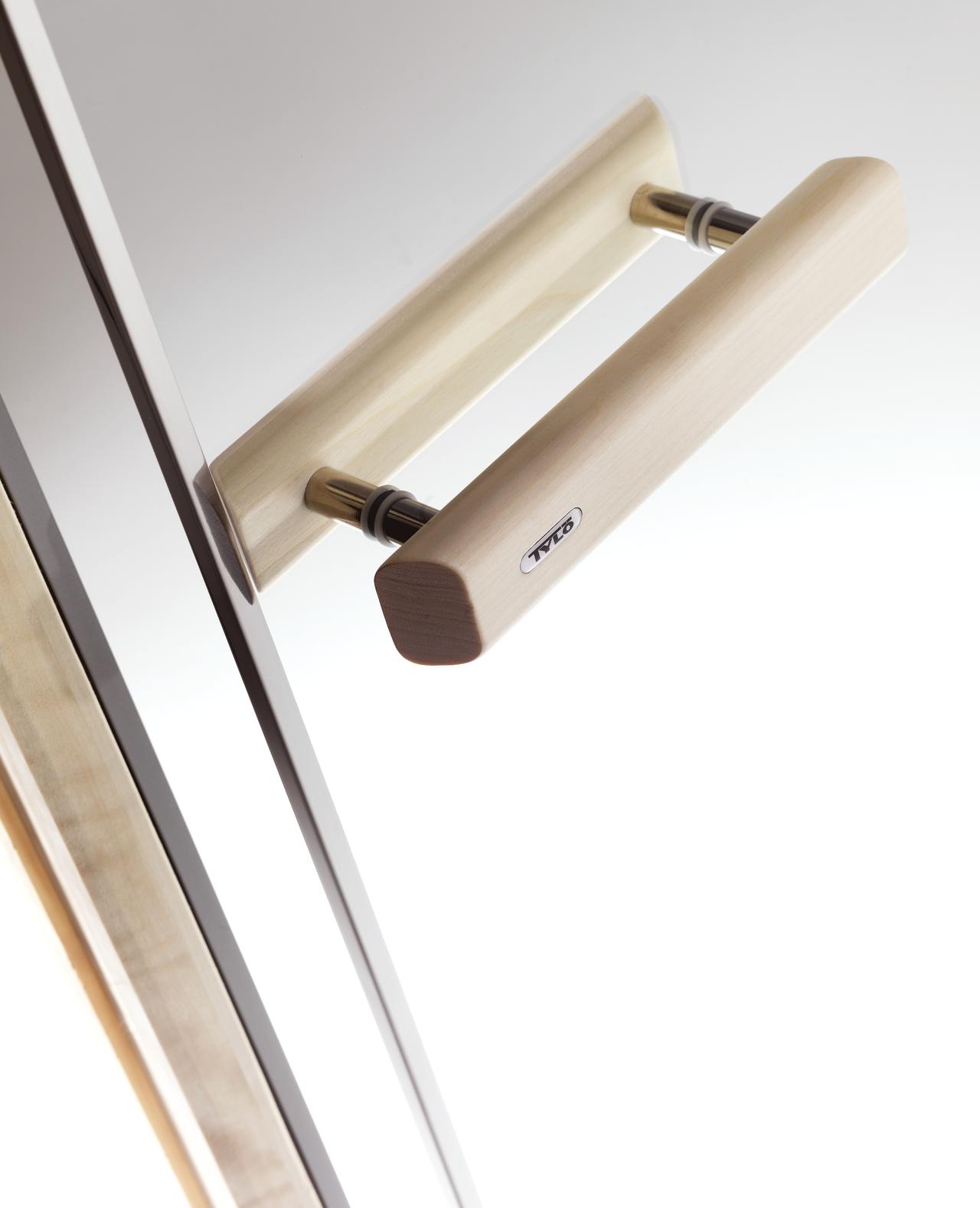 • Рами для дверей Tylo створені з багатошарового дерева. Полотно самих дверей зроблено зі спеціального загартованого димчастого скла, яке сертифіковане з безпеки і витримує без деформацій температуру до двохсот градусів за Цельсієм. Для захисту від найменших втрат тепла використовують спеціально розроблений силіконовий ущільнювач. Всі двері з магнітним замком можуть монтуватися і в дзеркальному відображенні. Двері Tylo DGL - лінійка ексклюзивних дверей для сауни. Скло DGL 7х19 виконане із загартованого безпечного скла товщиною 8 мм, яке може бути як прозоре, так і тоноване. Міцна рама (товщина 92 мм) виконана з осики із запатентованим ущільнювачем. Двері обладнані магнітною смугою для щільного закривання. Міцні петлі зроблені з алюмінію з заглушкою з нержавіючої сталі. Універсальні
