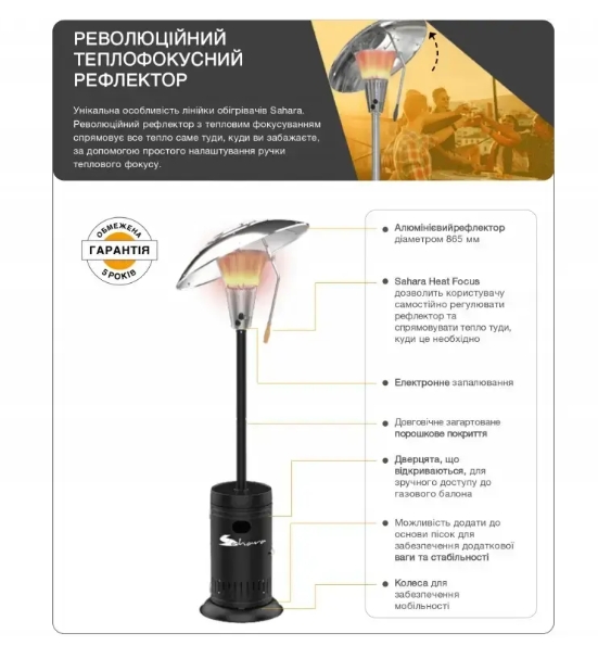 Унікальна особливість лінійки обігрівачів Sahara Heat Focus полягає у рефлекторі з тепловим фокусуванням, який дозволить за допомогою ручки теплового фокуса спрямувати все тепло туди, куди ви забажаєте, що якісно відрізняє Sahara Heat Focus від класичних газових обігрівачів із фіксованим рефлектором.