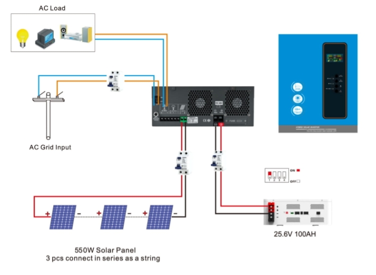 Сумісність з сонячними панелями: Інвертор працює з усіма панелями, максимум до 150V з однією зборкою та до 60А сумарно по струму. Це робить його сумісним з більшістю сонячних панелей, що є на ринку.
